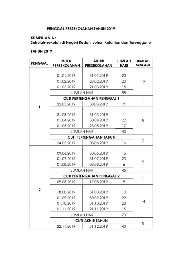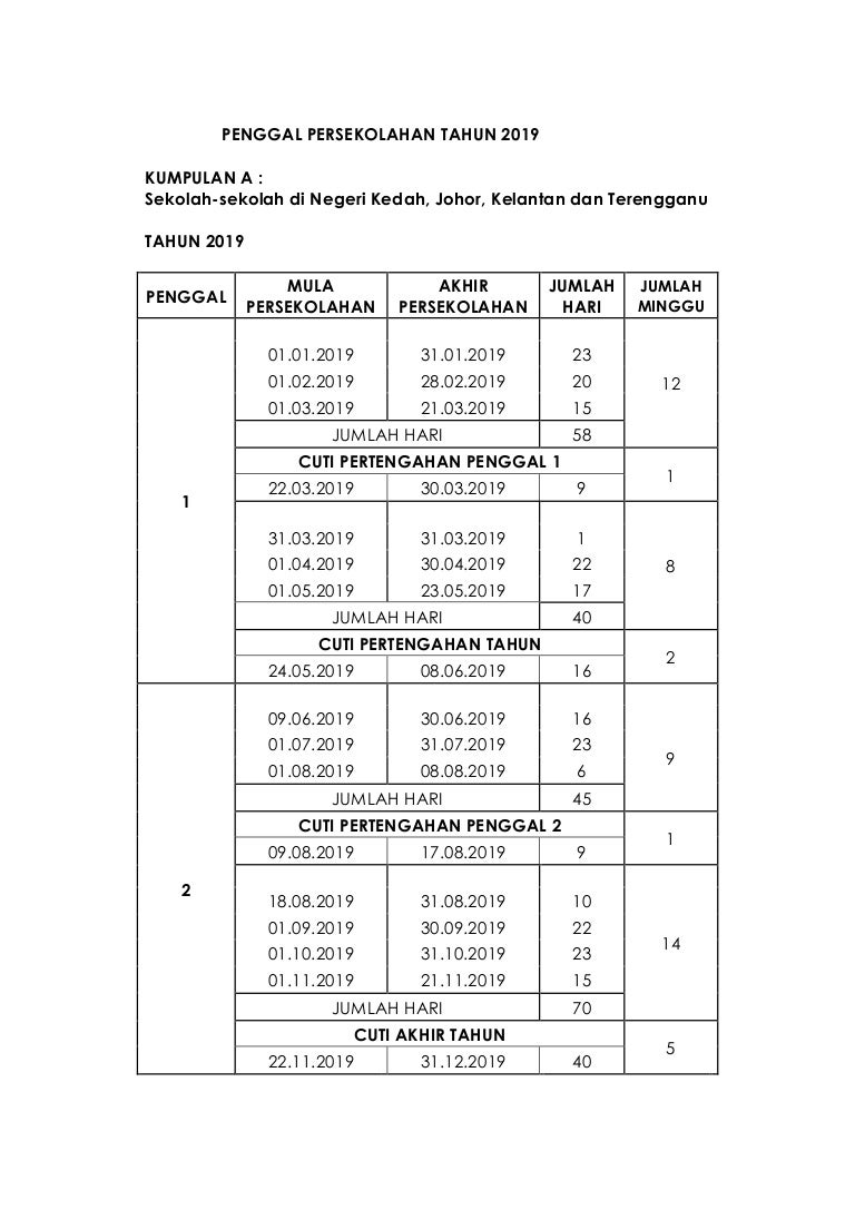 takwim persekolahan 2019 kumpulan a